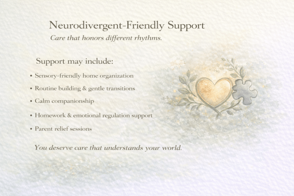 This may include sensory-friendly home organization, routine building, gentle transitions, and homework or emotional regulation support — without forcing conformity.