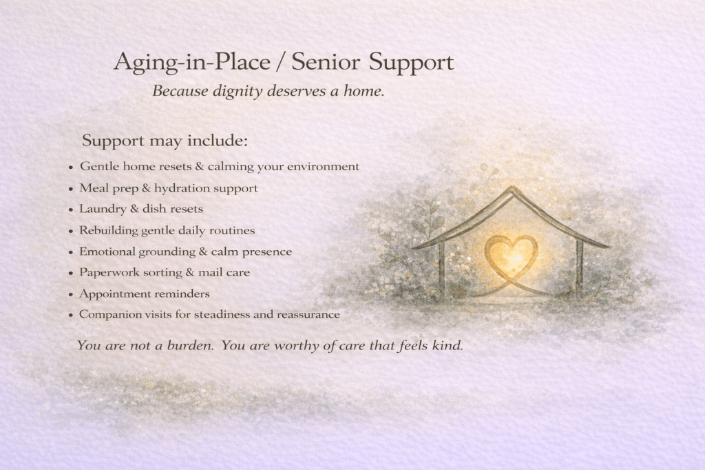 Support may include home resets, paperwork and mail sorting, packing or unpacking, errands, and meal prep — practical help that brings steadiness when life feels fragile.