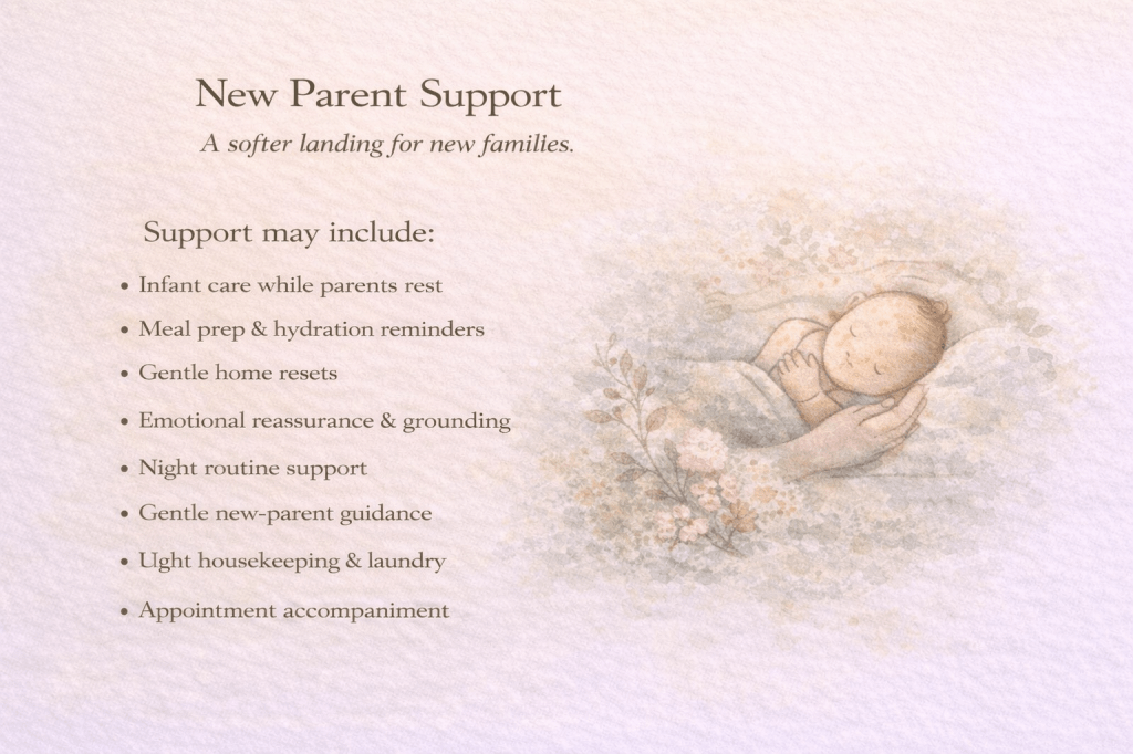 Support may include infant care while parents rest, gentle home resets, meal prep, hydration reminders, and light household support — creating space for healing and bonding.